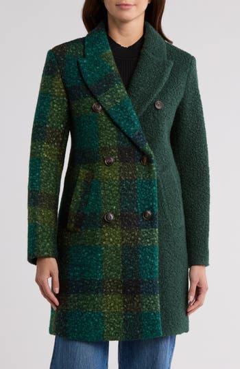 A plaid pattern adds an enriching finish to a bouclé knit coat with a double-breasted front that offers a timeless, versatile look over any ensemble while keeping you cozy.