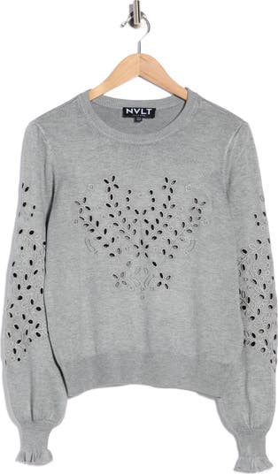 Eyelet embroidery punctuates the front and sleeves of a crewneck sweater that brings a fresh take on a classic silhouette.