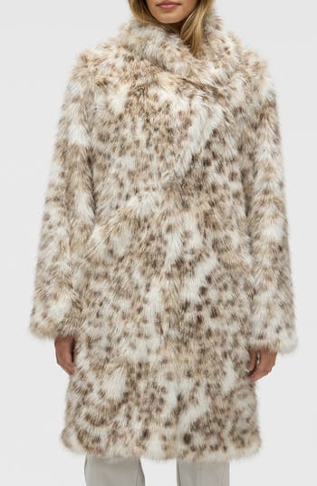 Fuzzy faux fur brings luxe appeal to an animal-print coat topped with an exaggerated shawl collar for statement-making style.