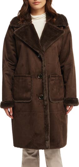 Plush faux fur trims the edges and lines the interior of a longline coat fashioned from faux suede for luxe appeal.