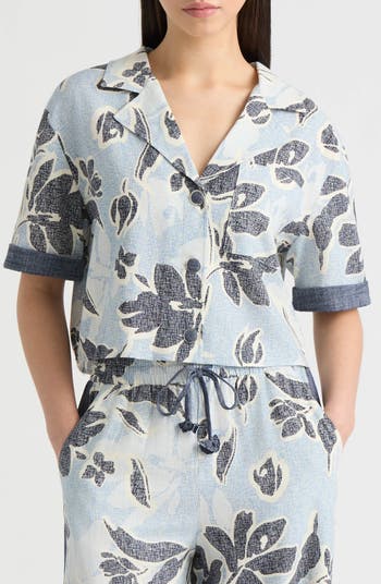 A tropical-inspired print of flora and fauna animates a woven button-up finished with short sleeves. Covered buttons and a notch collar add a little polish to a cropped, vacation-ready shirt you'll reach for on repeat.