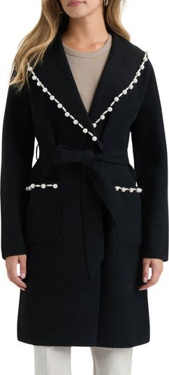 Pearly beads bring elegant shine to this ultrasoft sweater-coat framed by a cozy shawl collar, handy patch pockets and a removable tie belt.