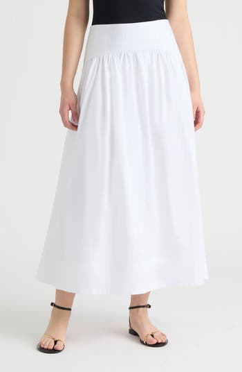 A flat-front yoke subtly defines the drop-waist silhouette of a poplin-woven midi skirt made from crisp, cool cotton.