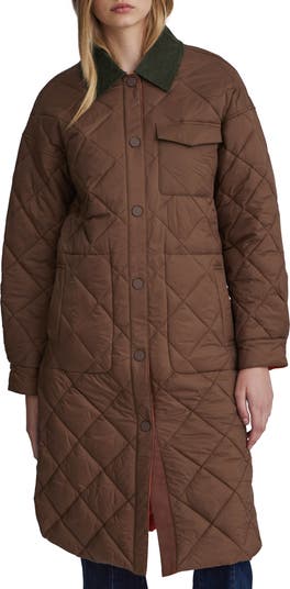 A longline silhouette enhances your comfort and coverage in a quilted shacket topped by a contrasting corduroy collar.
