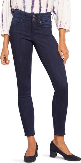 A double-button closure elevates the look of these stretch-kissed skinny jeans detailed with four-pocket styling. Exclusive lift-tuck technology smoothes and supports in front and lifts in back.