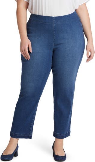 Stylishly relaxed from thigh to hem, these stretchy jeans feature a smoothing, flat-front pull-on waist and Lift Tuck® Technology that slims from within.