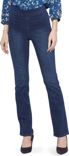 Soft, stretchy straight-leg jeans create a streamlined silhouette and feature a pull-on design for easy wear. Exclusive lift-tuck technology helps flatten the tummy and lift the rear.
