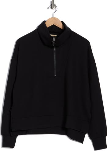 Love to layer with this sporty ribbed half-zip sweatshirt cut in a slouchy silhouette and framed by a vented high-low hem.