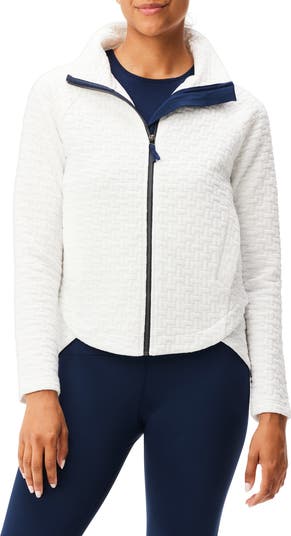 Geometric quilting creates a tessellated effect across the surface of a season-spanning jacket perfect for braving the cold after working up a sweat at the gym. Raglan sleeves and a unique overlapping hemline further the sporty appeal.