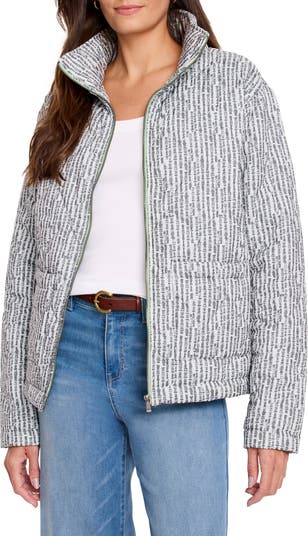 Your new favorite low-profile puffer jacket features diamond quilting and a quietly lively print.