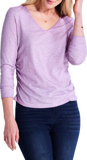 A sleek V-neckline and long sleeves frame this top that's crafted from pure cotton with shaping side ruching.