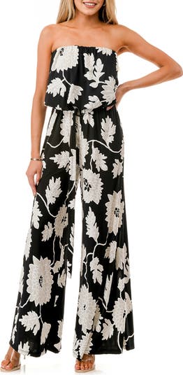 A woven wide-leg jumpsuit has you looking chic as ever thanks to its flirty strapless profile and bold print.