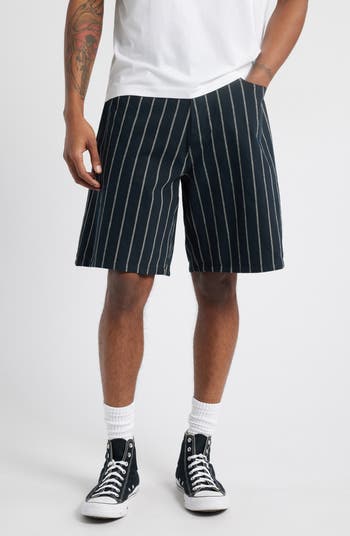 A baggy fit draws inspiration from the laid-back aesthetics of Y2K in rigid denim shorts patterned in high-contrast stripes.