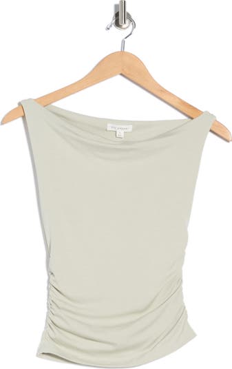 This off‑the‑shoulder top features ruched sides that create a softly flattering shape.