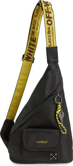 An asymmetric design brings contemporary edge to this sling bag shaped from durable nylon and outfitted with a webbed strap.