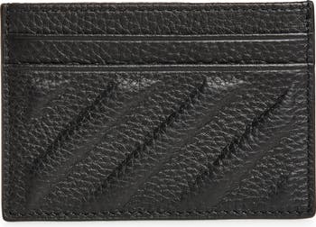 Silvertone arrows authenticate a slim, black card case fashioned from richly pebbled leather with diagonal stitching.