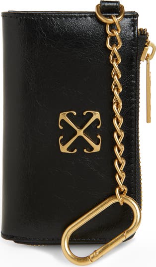 The iconic intersecting arrows bring house-signature shine to this crackled leather wallet suspended from a gleaming key chain.