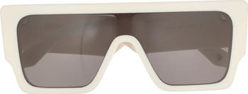 Contrasting embossed logos highlight the arms of these Italian sunglasses shaped in a shield silhouette.