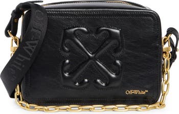 The brand's iconic crisscrossing arrow motif lends heritage appeal to a nylon camera bag suspended from a polished chain strap.
