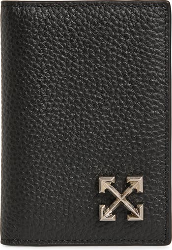 Silvertone arrows and quoted lettering authenticate a north/south bifold wallet fashioned from richly pebbled leather.