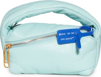 A padded bag boasts Off-White signatures such as a zip-tie tag, paper-clip zip pull and a hole-edged strap inspired by both Swiss cheese and meteor showers.