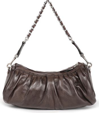 Glossy hardware enhances the appearance of a luxurious leather shoulder bag, which boasts a scrunched barrel shape for added allure.