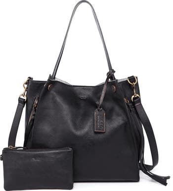 One of our most beloved signature styles, our Daisy Tote is a chic and easy carryall for all your daily needs. A classic silhouette is updated with on-trend tassel pullers and antique-look grommets hardware that finishes the entire vintage-distressed look. - Dual top handles - Single detachable shoulder strap - Open top with magnetic closure - Exterior features hand painted vintage finish construction with 4 tassel zip side pockets - Interior features removable zip pouch, wall zip pocket, and wall slip pockets - Approx. 13" H x 12" W x 5" D - Approx. 9" handle drop, 24" strap drop - Approx. 4.5" H x 8" W x 0.5" D pouch - Imported