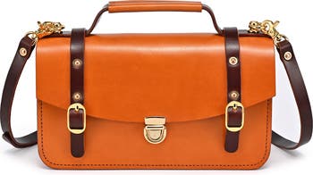 A classy leather messenger bag will add a vintage touch to your looks. - Single top handle - Detachable, adjustable shoulder strap - Foldover flap with push lock - Interior features slip pocket - Exterior features decorative strap buckles and leather construction - Imported