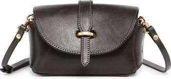 Glossy hardware enhances the retro-cool look of a luxurious leather bag, which boasts a snap-button side panels for added allure.