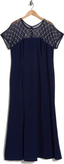 Glistening crystals and lustrous faux pearls in a diamond pattern elevate the sleeves and yoke of this evening-ready gown cut from stretch scuba-crepe fabric.
