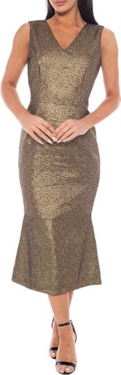 Shimmering metallic brocade brings opulent shine and texture to this elegant mermaid dress that's perfect for your next special occasion.