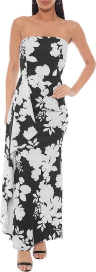 High-contrast blooms create a stunning gardenscape on a crepe gown cut in a strapless silhouette to show off some skin.