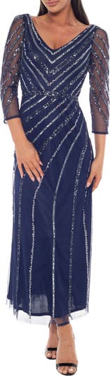Sparkling sequins arranged in chevron and diagonal lines catch the light beautifully in this cocktail‑ready dress framed by mesh three‑quarter sleeves.