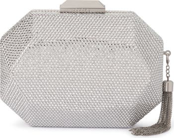 Embellished with tiny crystals, this compact bag is sure to make every look sparkle. With an eye-catching faceted construction, this modern accessory can quickly change to a shoulder bag with the removable chain, making this the ideal choice for evening events and date nights.