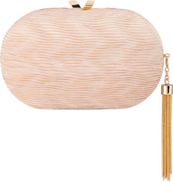 A metallic tassel and pleated satin exterior bring luxe elements to an evening-ready clutch fashioned with an optional chain strap for hands-free carry.