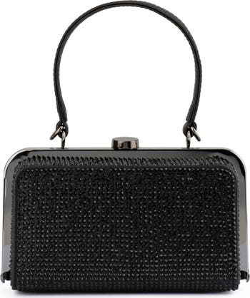 Elevate your next night-out ensemble with this compact handbag encrusted with shimmering crystals and outfitted with an optional chain strap for hands-free carrying.