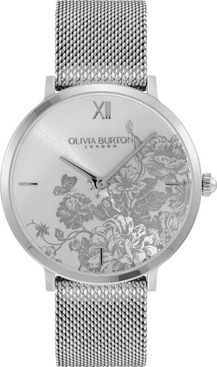 Add a hint of nature to everyday looks with this mesh strap watch featuring a minimalist silhouette enhanced by a floral design on the sunray dial.