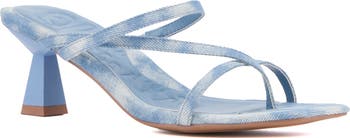An architectural heel elegantly lofts a slide sandal encrusted with rhinestones and designed with a squared toe for modernist appeal.