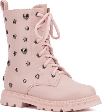 An assortment of metal studs add charming detail to these colorful combat boots thoughtfully designed with a side zip closure for an easy, kid-approved finish.
