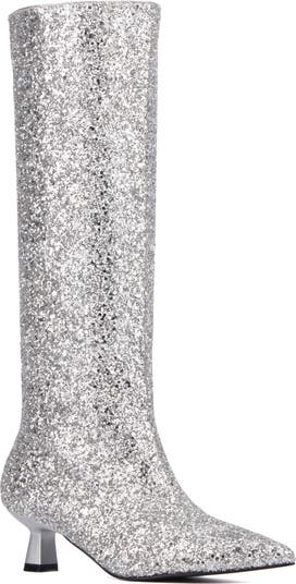 A slender pointy toe and an architectural kitten heel bring party-ready vibes to this elegant boot featured in a knee-high silhouette.