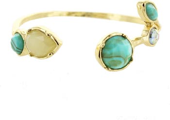 - 14K gold plated detailed mixed stone cuff bracelet - Slips on over wrist - Approx. 2.5" diameter, 0.75" height - Imported