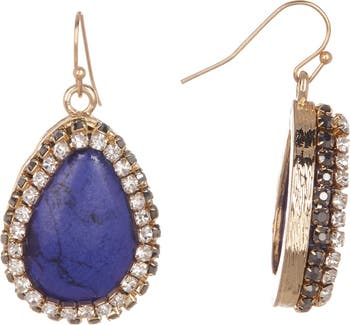 - 14K gold plated double halo set simulated blue pear cut stone drop earrings