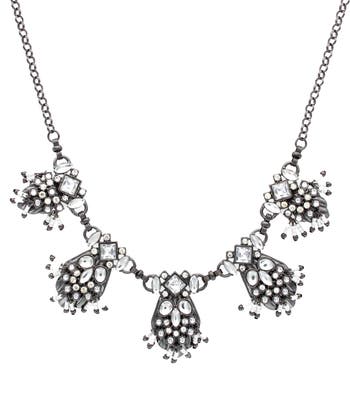 A collection of mutli-shapes stone and beads compose this statement-making necklace that adds elegance to any ensemble.