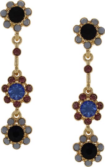 Glamorous goldtone double-drop earrings showcase a three blooming flowers at the studs and drops.