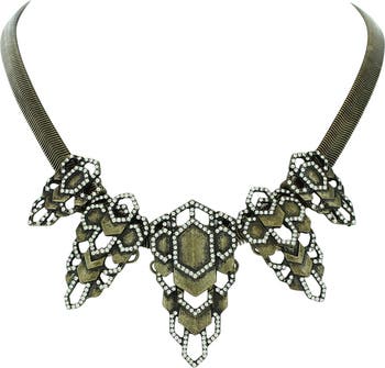 Striking geometric points detailed with crystal stone pave stone compose this statement-making necklace that adds edge to any ensemble.