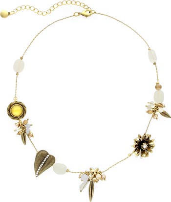Polished baubles add swingy accent to the gleaming resin stones on this playful necklace.