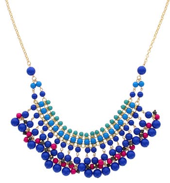 Show off boho-chic style with this vibrant bib necklace composed of multicolor beads in an artfully layered design.
