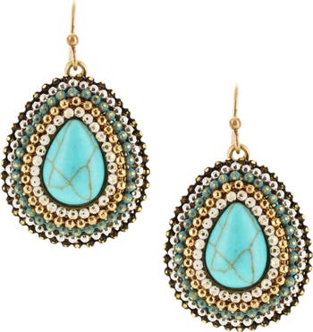 Rows of shimmering metallic beads surround a faux-turquoise teardrop on these sparkling boho-inspired earrings.