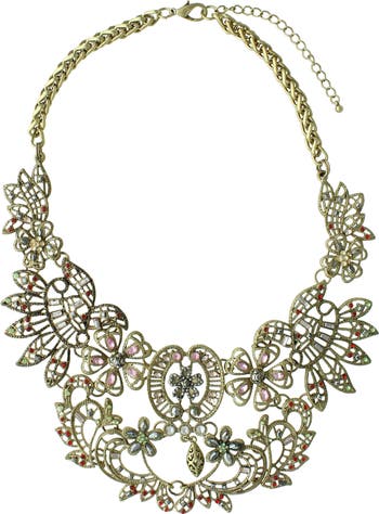 Crystals add sparkle to an antiqued cutout frontal necklace that adds statement making style to your look.