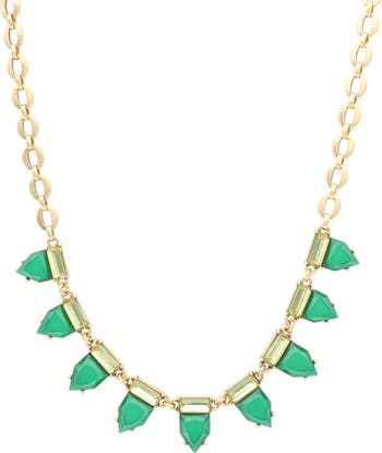 Shimmery crystals and faux stones bring boho-chic style to this layerable frontal necklace boasting a high-shine finish.